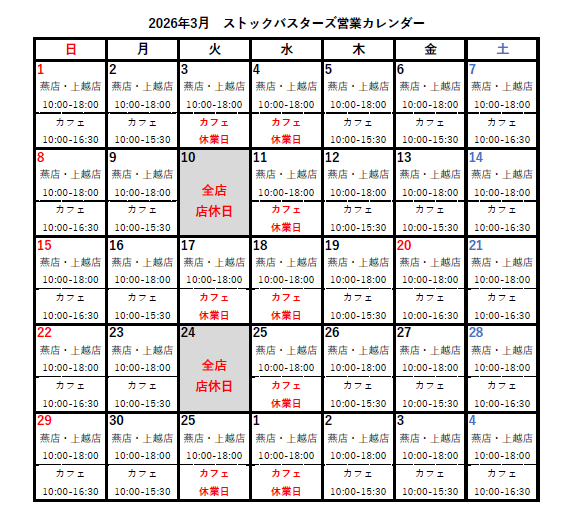 ◎燕店・上越店・・・3/10(火)、3/24(火)