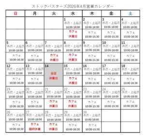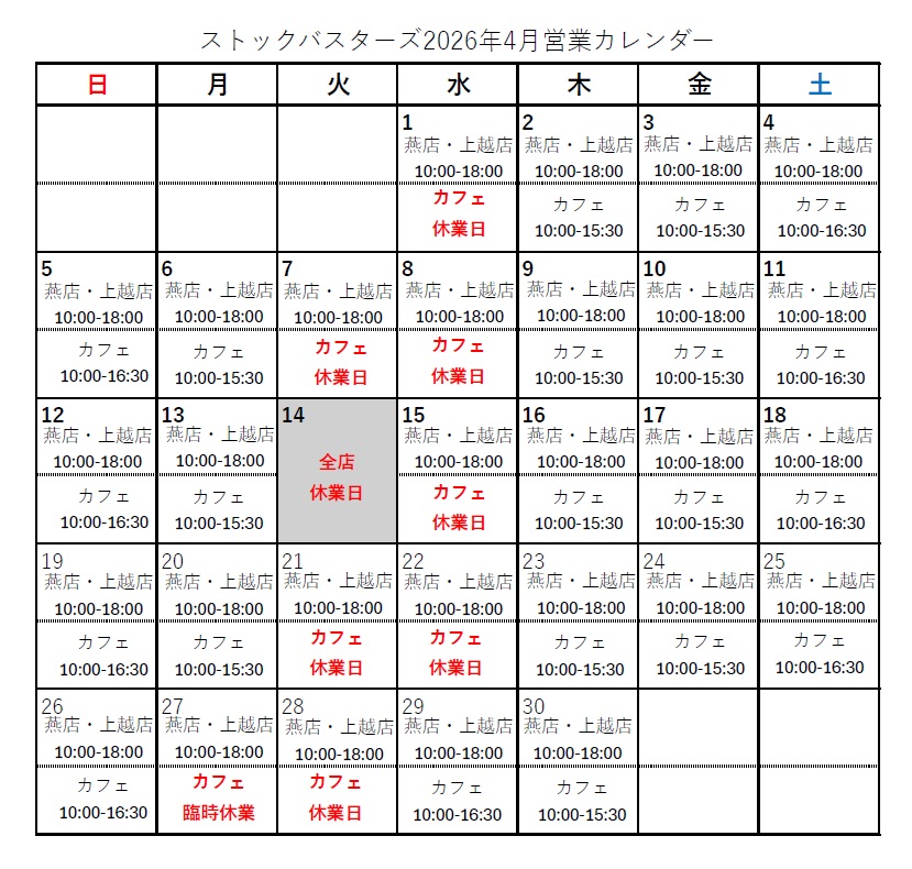 カフェは燕店・上越店と営業日、営業時間が異なりますのでご注意ください。